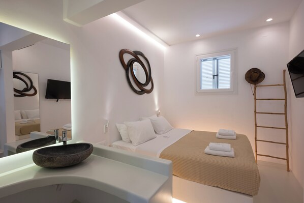 Nestled in the vibrant heart of Mykonos Town, Hyades Downtown Suites invites you to step outside and immerse yourself in local culture. Enjoy the comfort of a private entrance, free Wi-Fi, air-conditioning, a small kitchen with stovetop only and flat TV.