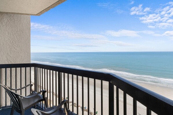 Escape to our Oceanfront Suite, where Myrtle Beach's serene seaside experience awaits. Unwind in style with a private balcony overlooking the ocean, and stay connected with wireless internet access. Enjoy entertainment options on two televisions and cook up your favorite meals in the full kitchen.