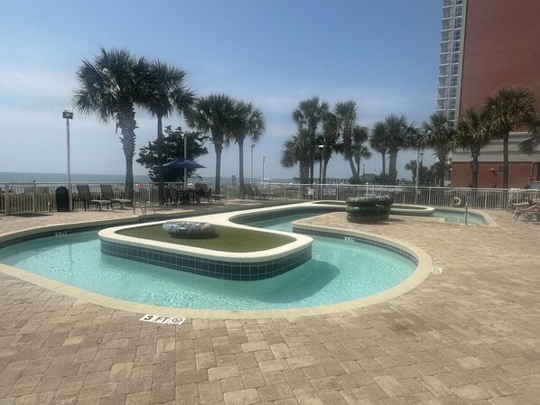 Atlantica Resort is a 2 building property. The North Tower where you are located at features 14 floors. On the property you will find 6 bodies of water including 2 hot tubs, a lazy river, kiddie pool, indoor heated pool and an outdoor pool. Located inside of the South Tower we have a Beach Club common area as well as men`s and women`s bathrooms.