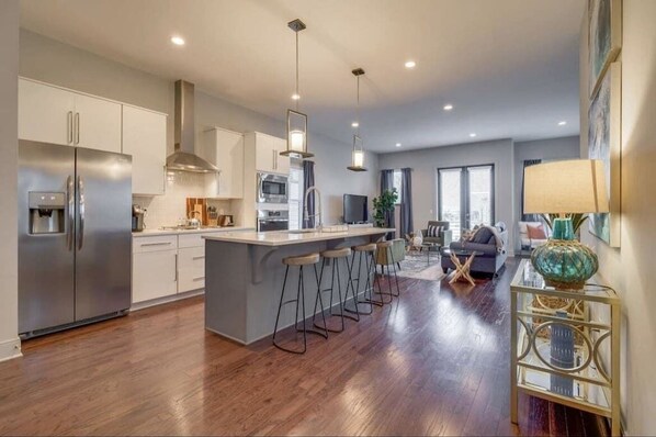 The kitchen is fully stocked with appliances and is part of a combined open-concept kitchen and living space that includes bar seating.