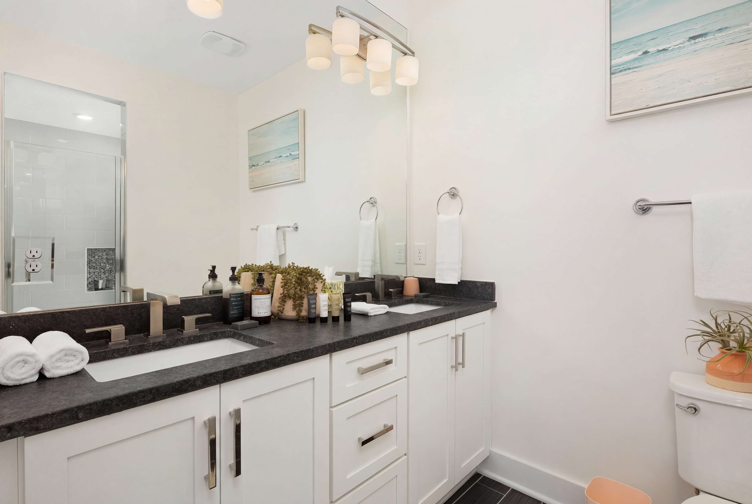 Ascend to the third floor, where two Primary suites await. The first suite boasts a luxurious king bed and an ensuite bath, while the second offers a comfy queen bed with its own private bath. Also located on this floor is a convenient laundry room with a washer and dryer, complete with complimentary detergent.