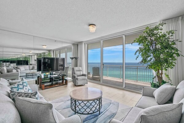 Incredible panoramic views welcome you into this beautifully decorated condo The balcony is spacious and one of few that has a full view of the Gulf of Mexico and a wonderful view of the Sound .The balcony is private as you cannot see balconies of any property on either side making the balcony very private.