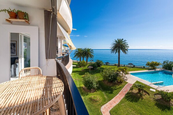 Indoor and outdoor living: Bright living room with direct access to a private balcony from which you can enjoy stunning views of the sea and the pool. A perfect space to relax, read or have breakfast outdoors.