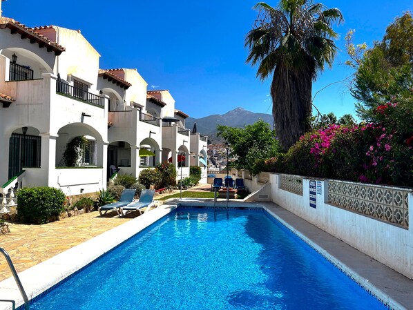 At El Califa, a charming ground-floor apartment in Nerja, enjoy al fresco dining on the large terrace or lounge by the 12m x 5m communal pool surrounded by lush gardens. With Burriana Beach just a five-minute walk away and historic Nerja within easy reach, experience all this beautiful Costa del Sol town has to offer.