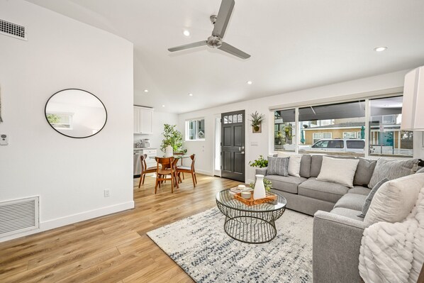 Unwind at this 2 Bedroom 1 Bath Brand New Renovated Beach Home, nestled just one block from the beach and steps away from Channel Park on the Bay. With a fully equipped kitchen, smart TV, WiFi, washer & dryer and a garage for two cars you'll feel right at home in this beautiful Newport Beach retreat.