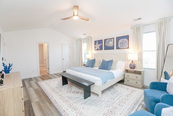 Retreat to the sleeping areas, where you'll find the luxurious main suite, a serene sanctuary designed for ultimate relaxation. Featuring a king-sized bed and a cozy sitting area. This tranquil haven is the epitome of coastal luxury. The attached ensuite bathroom boasts dual vanities, a soaking tub, and a separate glass-enclosed shower.