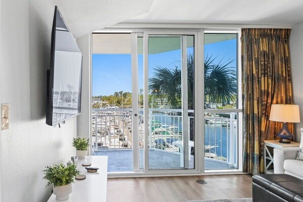 In North Myrtle Beach, this beautifully renovated Marina front condo boasts easy-access parking and a convenient central location. Enjoy the fully stocked kitchen, large family room area with access to the waterfront balcony and complex pool that features a shared outdoor heated pool and hot tub.