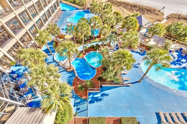 Escape to Beach Cove Retreat, an oceanfront haven with a tropical theme. Unwind by the heated pools, hot tubs, or indoor pool, and enjoy the lazy river. Your beachfront retreat features plush queen mattresses in the main bedroom and a stocked kitchen.