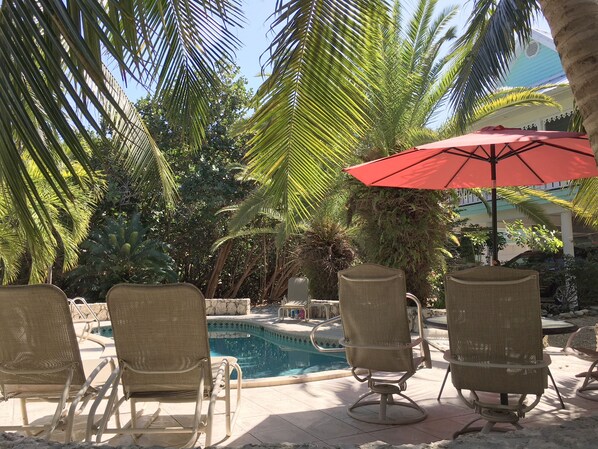 The pool area holds 4 high chairs and tables, and 2 chase lounges. Floaters and toys are in the storage room, across the Garden View room. Beach towels are upstairs at the entry cabinet.