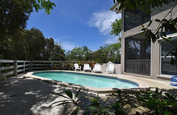 Large home on 11 acres surrounded by nature with a pool and ocean views. Need to get away from it all but want the comforts of home? Relax on the deck, cool off in the pool, enjoy the sounds of birds from either of 2 screened in porches, or relax in the airconditioned comfort of the living areas. Rooms are arranged on two floors with 3 bedrooms and 2 bathrooms upstairs and one bedroom and bath on the ground floor. Birdwatchers will see all of Cayman's woodland birds and seasonal migrants at home in the forest of native trees and plants. The wetlands below attract wading birds and local and seasonal ducks. Opportunities for exploring abound or just enjoy the pace of life in this peaceful village. A 3 minute walk and you are on the North Coast beach with superb snorkeling, fishing and shelling. A short drive away are restaurants, stores, watersports and natural attractions including caves and the botanic park.