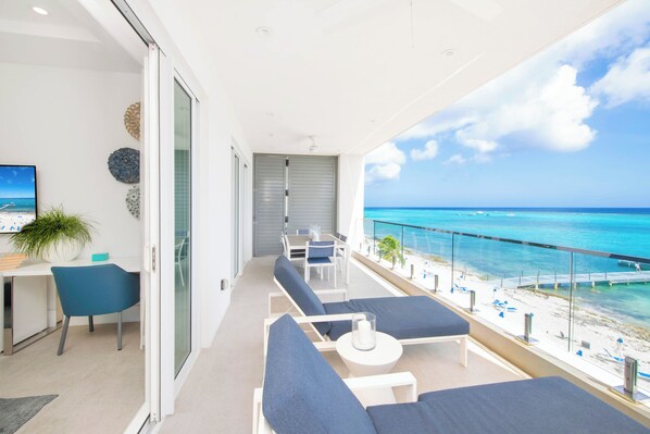 All Rum Point Resort condos feature sleek finishes, designer decor, and an open-concept layout maximizing space, natural light, and stunning ocean views. All the comforts of home are included in this 1,350 sq. ft. 1-bedroom + den premium condo including gourmet kitchen appliances, quartz countertops, SmartTVs for streaming, and a private oceanfront balcony.