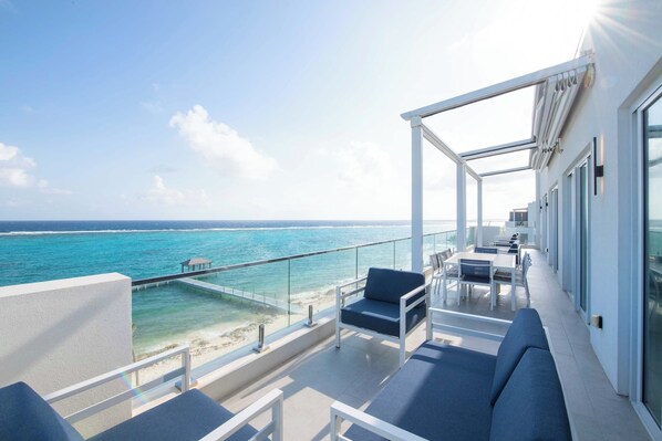 Walk out from the living area onto the private open-air balcony overlooking the resort's pool deck and beachfront. The balcony stretches the full width of the home providing ample outdoor living space to savor the panoramic ocean views. Furnished with an alfresco dining table and outdoor seating you will love dining and lounging amid the sky-high scenery. The balcony is also equipped with retractable awnings providing shade and relief from the island sun.