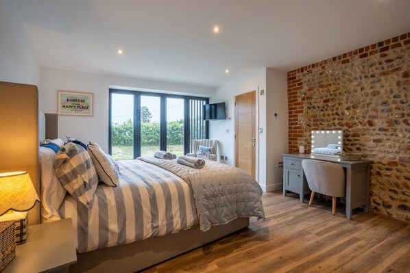 All on one level, Field Barn features a spacious living room with comfortable seating, a dining table and a Smart TV. The modern kitchen and dining area is well equipped with an integrated fridge and freezer, electric hob, integrated oven, microwave, coffee machine and dishwasher, while a handy utility room provides a washer and dryer.
