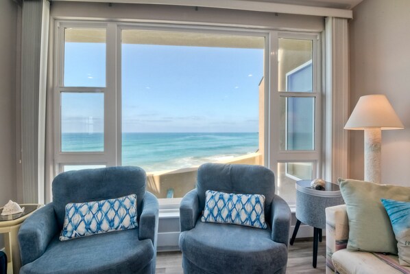 - Sunny living room with ocean views and sliding doors leading to private balcony with views of the coastline and the Oceanside Pier