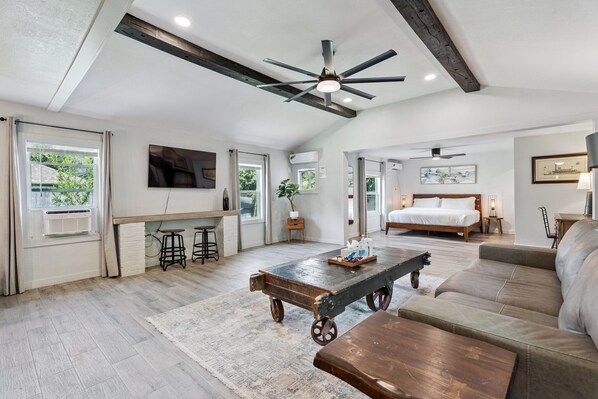 Stylish 1-Bedroom Retreat with open living space, fully equipped kitchen, and cozy king bedroom designed for comfort. This fully furnished studio is designed for convenience, flexibility, and ease. Perfect for business or leisure stays, with thoughtful touches to make you feel at home.