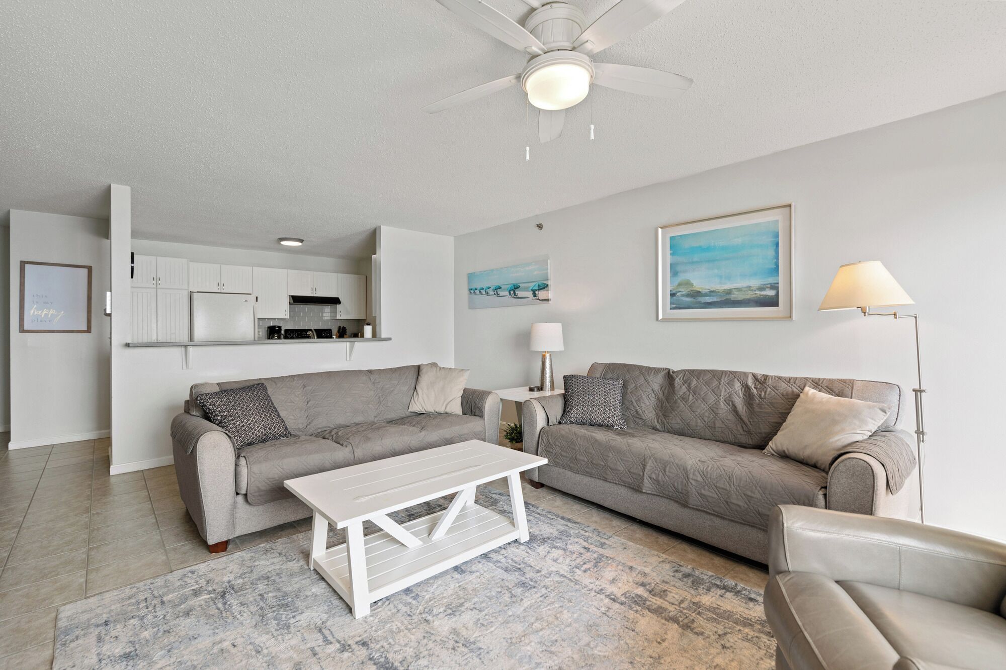 The living room has a comfortable couch, coffee table and a flat screen, Smart TV where you can enjoy logging in to your streaming network channels like Netflix, Prime & Hulu.