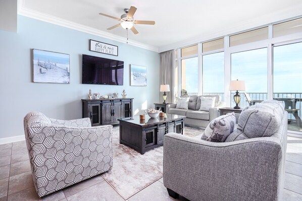 The Primary suite is a haven of relaxation, boasting a King bed and a 65-inch flat-screen TV for your entertainment. The private Primary bath is outfitted with dual vanities, a jetted tub, and a separate shower, ensuring a spa-like experience. The second bedroom is equally impressive with 2 Queen beds, a private bath, and a 42-inch flat-screen TV. Additional guests can be accommodated comfortably on the sofa sleeper in the living room.