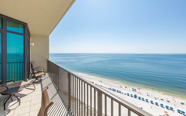 Out on your private Gulf-front balcony, the views are breathtaking and there’s plenty of seating for everyone. Whether enjoying a cup of coffee in a comfortable chair, an afternoon nap on a chaise lounge, or an al fresco meal at the table for eight, you’re going to love it here.