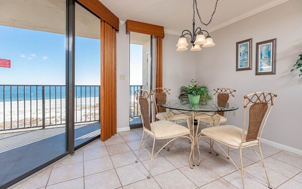 Find your place in the sun! The bedroom has carpeted floors and a pickled wicker king bed with green and cream bedding. A nightstand with a lamp stands on each side, and there is a chest of drawers and a mirror, plus a stand with a TV. The bath has a shower/tub. In the dining area, a glass and metal table seats four at wicker and metal chairs with pale yellow cushions. Nice artwork adds color. The kitchen has a tile floor and white countertops and cabinets, with texture ivory wallpaper and white appliances. Two stools sit at the kitchen bar. An area rug sits in front of the wicker sofa with its tropical pattern, and two brown chairs with ottomans flank each side. Two end tables and a matching coffee table provide plenty of surface space, and there is a mirror over the sofa that opens the room. A wicker desk stands nearby, and a black parsons chair adds one more seat, with a palm tree mural behind it. An entertainment center holds a stereo system, a TV, VCR and DVD player.
