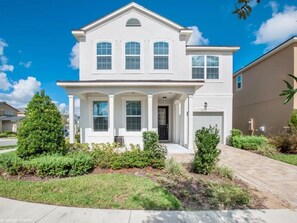 At Solara Resort, unwind in this spacious 7-bedroom haven with a private screened-in pool and child safety fence. Inside, enjoy the comforts of central AC, a fully equipped kitchen with towels and linens provided. With free cable TV & WIFI plus outdoor patio furniture for sun loungers.