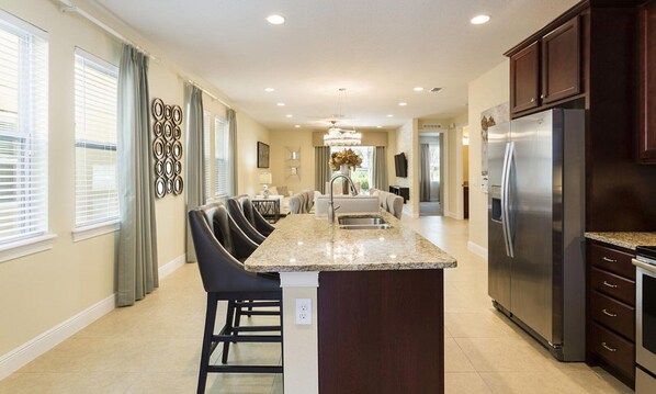 When long days at the parks or on the golf courses have taken their course, you ll find the well-appointed and comfy five king, one full, and one bunk-bed room just what you need to lay your head on the pillow. Kids will love the homage to everyone s favorite teen wizard in the bunk-bed room, including whimsical props. Young princesses will be delighted with the theatrically-designed, and frosty-inspired bedroom fit for royalty. Before you hit up the parks another day in the morning, do your morning stretch out by the pool on your private, palm-tree enclosed patio. Have your fruit and coffee and decide whether to take a break, chill out and hang at home for the day, or have another go at the roller coasters. Either way, you ll have a ball soaking in all of that much-needed Florida sunshine.