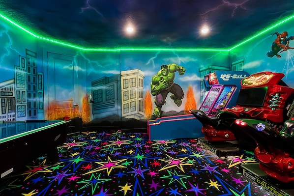 Superhero-themed black light games room has an air hockey table, basketball shooting game, skeeball machine, and 2x arcade racing games