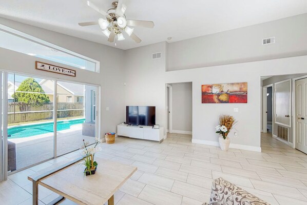 Minutes from the theme parks and local attractions, this beautiful Floridian home welcomes you with an open floor plan. Unwind in the heated pool or cookout on the large deck area.