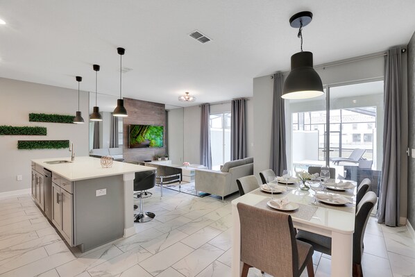 Experience the ultimate getaway in The Cove at Storey Lake, a 4-bedroom townhouse perfect for family and friends to create memories. Enjoy sunset views by the private pool, and take advantage of resort-style comforts like a fitness center, lazy river, hot tub, and tiki bar nearby. With high-speed WiFi and designer finishes throughout this 1950 square foot space.