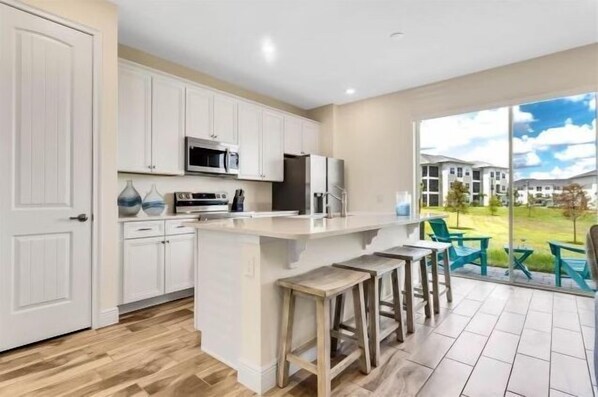 As you step inside, you'll be transported to an oasis of seamless flow and open concept design between kitchen, dining and living areas. The bright and modern kitchen is equipped with stainless steel appliances and all the tools you’ll need to make delicious meals from home. Additional small appliances for your convenience include a coffee maker, toaster, kettle, blender and Margaritaville Margarita Machine ( because it’s 5 ‘o’ clock somewhere). You will just love the cozy atmosphere where you can unwind and relax after a long day at the parks. Ideal for families and groups traveling to Disney, this wonderfully appointed home will have you seeing the sights daily, just miles away!