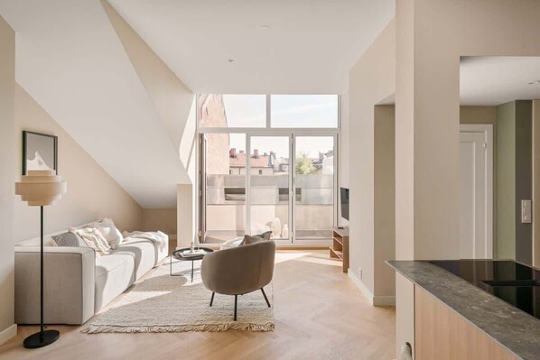 The building dates back to the 1800s, and during the restoration, great emphasis was placed on preserving its historical charm with original details and replicated windows from the construction period. The apartments feature oak parquet floors, Huseby kitchens, elegant bathrooms, and are furnished in a modern Scandinavian style. When you enter, you will use original stairs and handrails that have been well-preserved for nearly 150 years. All apartments have either a spacious balcony, a private rooftop terrace, or access to charming seating areas in the lush and secluded backyard. Here you will experience "Quiet Luxury" and the perfect combination of past and present.