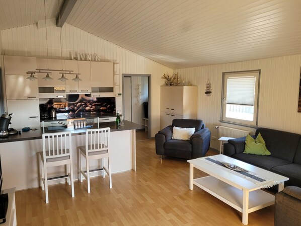 Lakefront holiday home with kitchen and patio