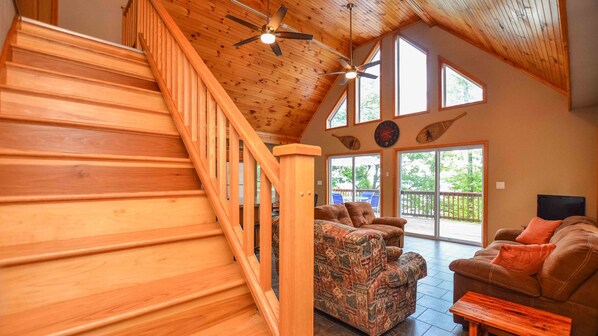 Inside, you'll love the open floor plan with chalet-style windows that fill the space with natural light and stunning views of the surrounding woods. The fully equipped kitchen has everything you need to prepare your favorite meals, complete with a large island and breakfast bar — perfect for gathering with your group and sharing stories over breakfast or dinner.