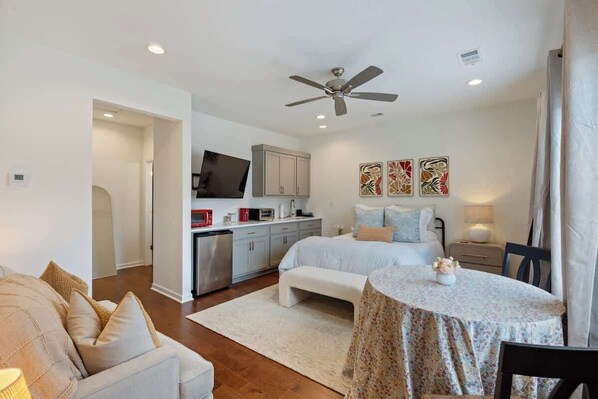 Located above the garage of the main house, this guest suite has its own private entrance and sleeps two. It features a super comfy queen bed with a 12" memory foam mattress, a 55" Smart TV for streaming your favorite movies and shows, and a loveseat. The bathroom includes luxe toiletries, a hair dryer, shampoo, conditioner, and body wash.