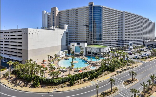 Beyond the comforts of your condo, Laketown Wharf Resort offers an array of amenities that cater to every age and interest. From the five resort-style swimming pools, including the lagoon pool deck and the zero-edge family pool, to the two Gulf side hot tubs and the interactive play pool with splash pad, fountains, and slides, there's endless fun awaiting you.