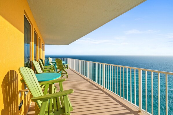 To the west, gaze out over 20 miles of pristine coastline, where the sunsets paint the sky in brilliant hues. To the east, take in the sights of the Intercoastal Waterway, Shell Island, the jetties, St. Andrews State Park, and Grand Lagoon. Move to the side of the balcony, and you'll even catch glimpses of Captain Anderson’s, the Hathaway Bridge, and more!
