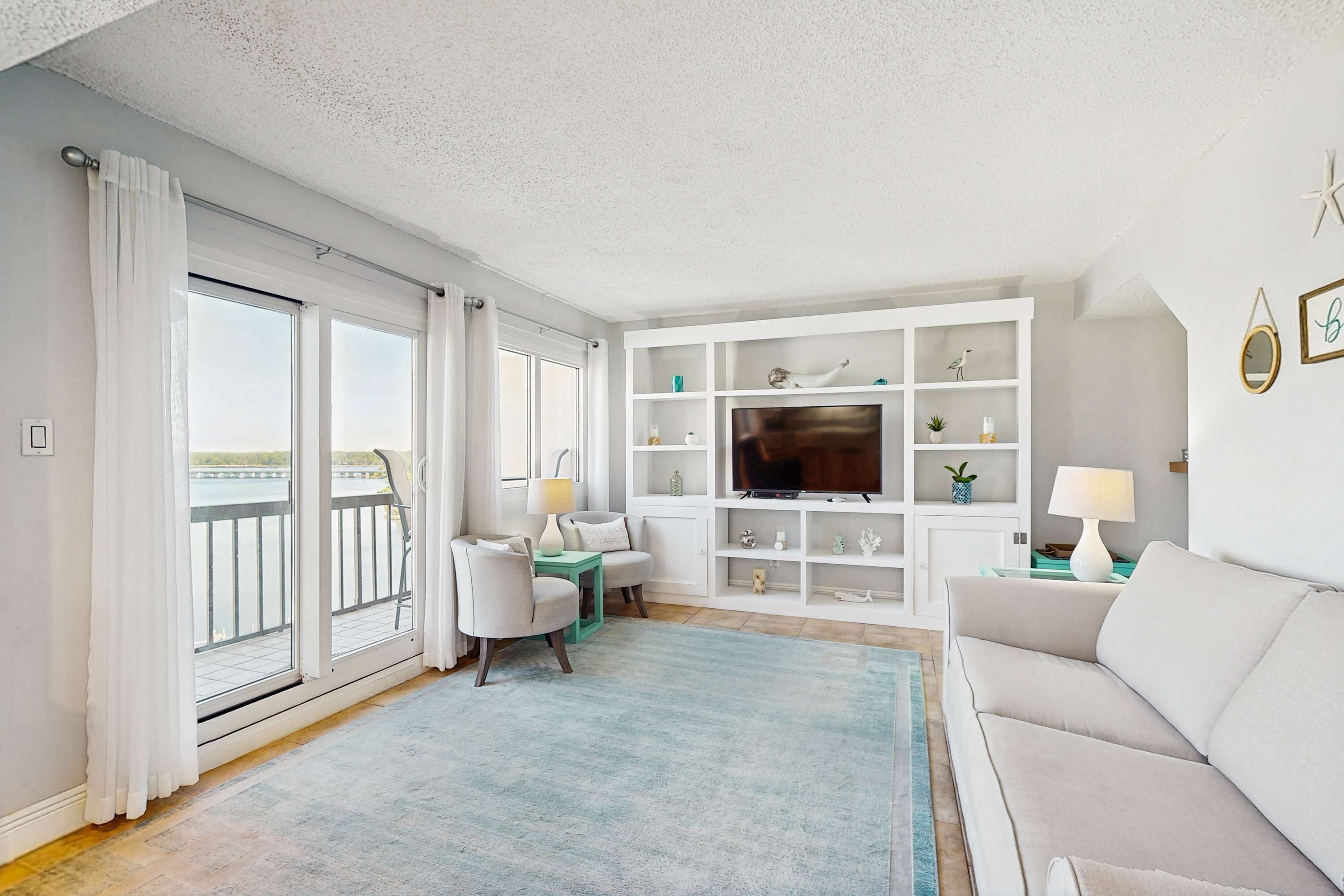 After a day of sun-soaked adventures, unwind in the inviting living area, where plush seating and tasteful decor create a cozy atmosphere for relaxation and conversation. Large windows let in plenty of natural light, giving the space a warm and welcoming ambiance.