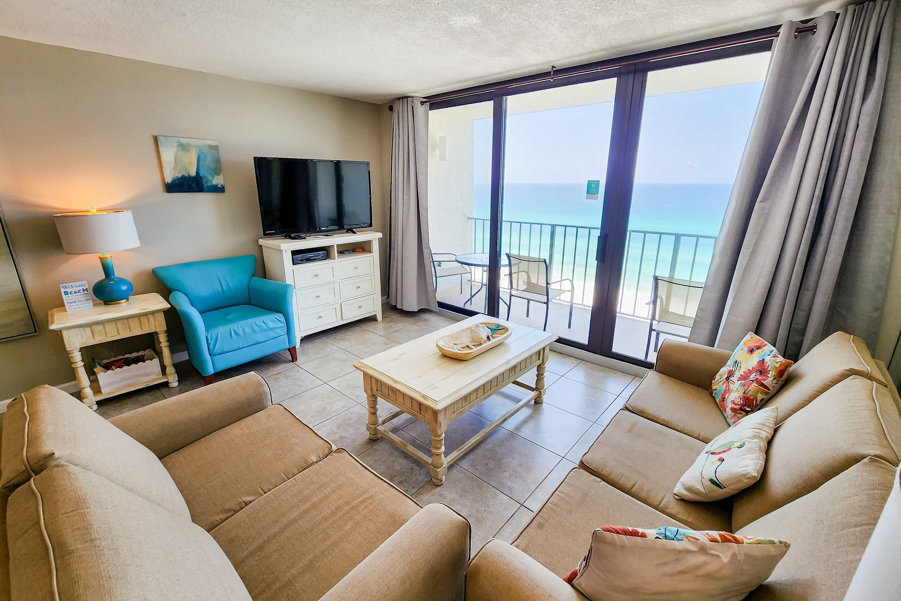 The recently updated condo offers plenty of living space with ample comfortable seating, a dining area, and a stylish bar. A Smart TV features HD service but you may never see it because the view of the amazing Gulf will keep your attention. Floor to ceiling windows allow you to soak up the view and people-watch on the beach. Start your day on our private balcony with your morning coffee or end it in the evening with a cocktail and the best view of the sunset in the country.