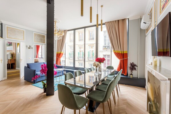 Located close to the Louvre Museum and the Marais neighborhood, this apartment combines industrial charm with contemporary elegance. High ceilings and large windows bring light to this spacious, functional space. Orange accents add warmth and comfort, while the quiet interior offers a peaceful space in the heart of a lively neighborhood. With its 4 separate bedrooms (including a mezzanine one), and its fully equipped kitchen, it’s the ideal home for a few days in Paris.