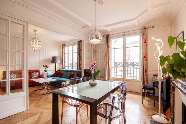 Nestled in Paris's family-friendly 15th, this two-bedroom apartment offers a tranquil retreat between Parc Georges Brassens and Parc André Citroën. Unwind with the grand piano, enjoy ambient dining by the beautifully embellished fireplace or take in charming courtyard views from one of two airy bedrooms.