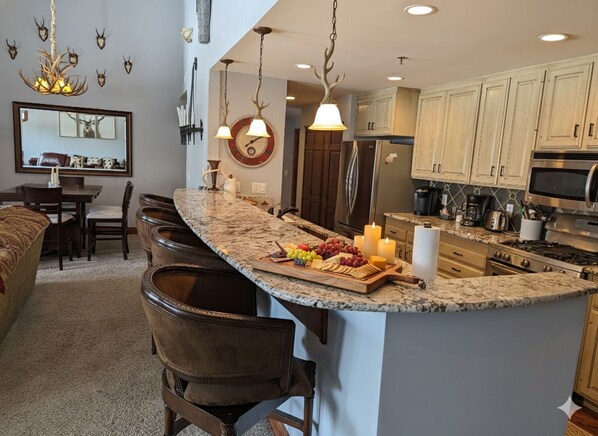Cozy up next to the large stone corner gas fireplace or warm up in the 6 person private hot tub on the deck after a chilly day of skiing or exploring the endless mountain biking and hiking trails in the area. The carpeted living room area has ample seating for your entire group with multiple couches and recliners and a TV above the fireplace. High speed internet is available via Wifi throughout the entire condo.