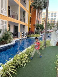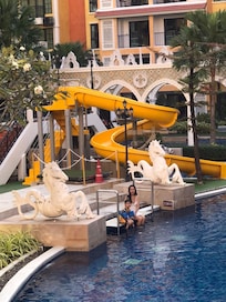 The Venetian Resort Pattaya on Jomtien Beach is family-friendly with free water park access. Adults relax in the sauna and steam room, kids have their own pool. Features include three outdoor pools with sun loungers, a garden coffee shop, and high-speed WiFi.