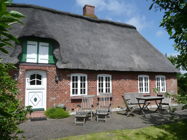 The Friesenkate (80 m²) accommodates 3 guests and is a traditional Uthland Frisian house, built in an L-shape with the classic interior layout of its era. The living spaces are arranged on two levels. A central hallway separates the former servant’s quarters and utility rooms, as well as the old stable, from the main living area. Today, the side rooms feature two modern bathrooms and a laundry room.