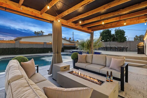 The pool is surrounded by comfortable sun loungers and shaded by stylish umbrellas. The outdoor dining area has a spacious table near the outdoor grille. The cozy firepit area invites you to unwind under the stars, with plush seating making it a favorite spot for evening gatherings.