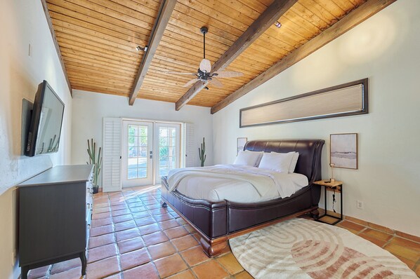 Primary Bedroom (Bedroom 1) The spacious primary suite features a California King bed, large TV, walk-in closet, and a private en-suite bathroom. Enjoy direct private access to the backyard, perfect for morning coffee or late-night poolside relaxation.
