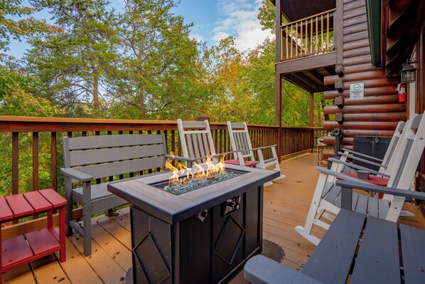 The spacious deck offers plenty of seating and a newly added gas firepit where guests can relax after a busy, fun-filled day.