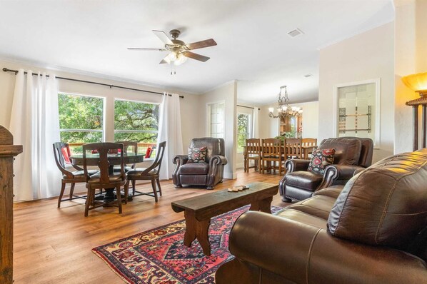 The oversized living room is designed for gathering. Stretch out on the leather sofa, settle into one of the reclining chairs, or break out the cards around the round game table. A cozy patterned armchair, vaulted ceilings, and a rustic wood-accented entertainment center with a Smart TV give the space its signature warm and welcoming vibe. Wood-style flooring, a ceiling fan, and Texas-themed decor-including a decorative longhorn mount-add to the home's authentic charm.