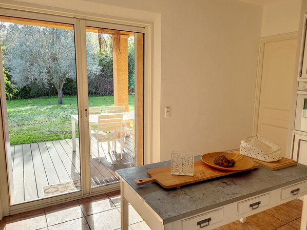 You arrive in a large very sunny living room / lounge furnished with taste and lightness overlooking the terrace with its large garden furniture, view of the swimming pool An independent kitchen with all the necessary, accessible by its glass door on the terrace. A scullery with washing machine, freezer, iron fridge and ironing board. A master bedroom with 160cm bed (2 beds can be separated), shower room with two sinks. Independent toilet.