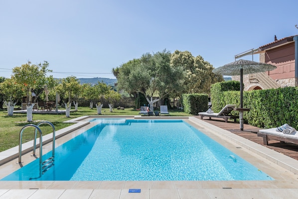 Enjoy your private 4,000 m² garden with orange trees and local vegetables and fruits you can taste. The private outdoor pool is 35 m² and includes a shared children's area. Relax on the covered private terrace, on the 2 private balconies with mountain views, or use the private barbecue for outdoor dining. An outdoor shower is also available.