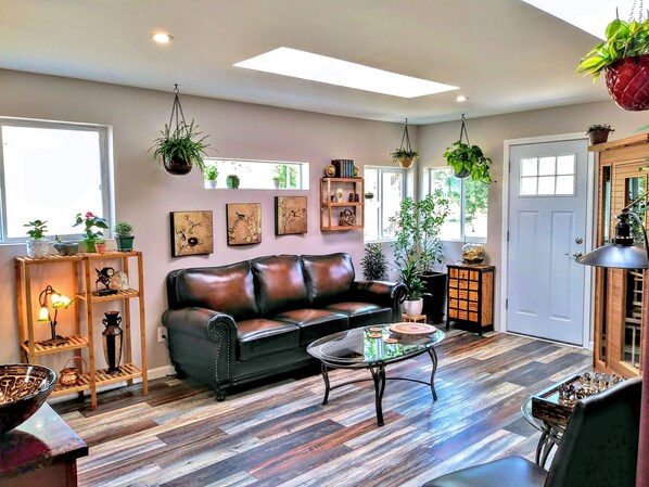 Larch Avenue Getaway is a haven for those seeking relaxation and connection with nature. Rejuvenate in the far infrared cedar sauna or unwind under the rain shower, then gather around a fire in the lighted garden.