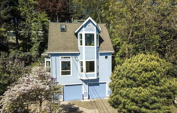 Perched on a small hill, Blue Cottage offers a serene retreat with breathtaking vistas of Mt. Hood, the Willamette River, and Downtown Portland. Guests can unwind in the fully stocked kitchen and living room or relax on the beautiful enclosed balcony or large deck surrounded by a natural habitat garden.